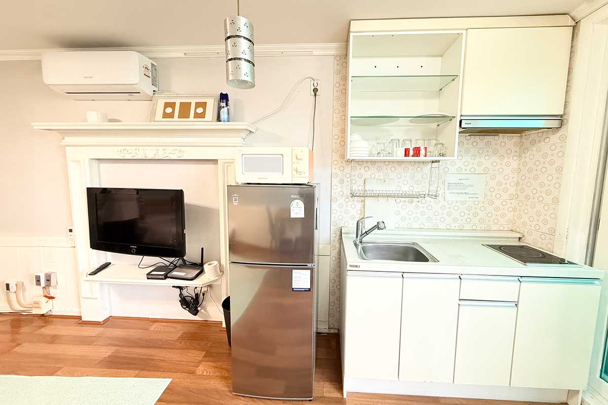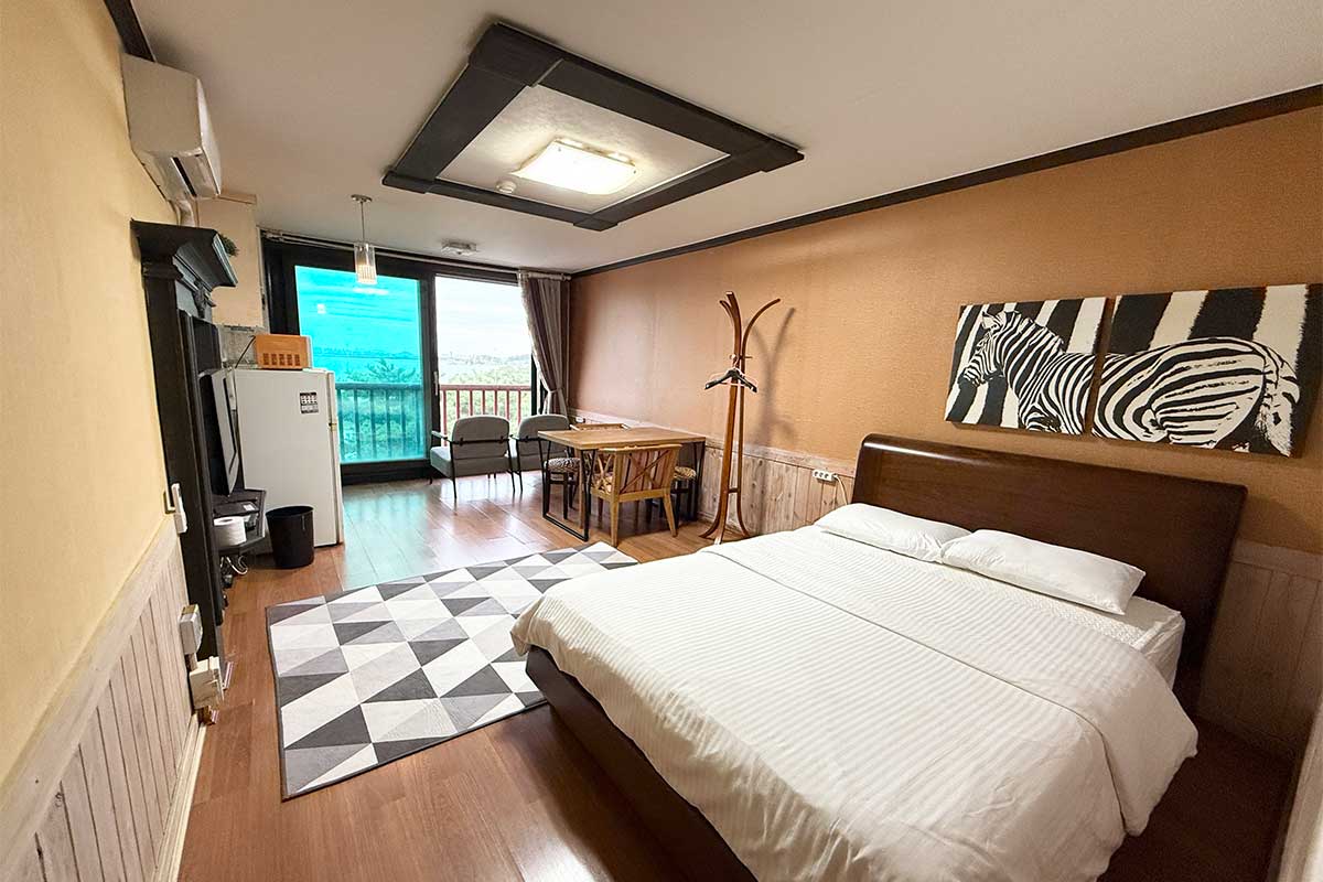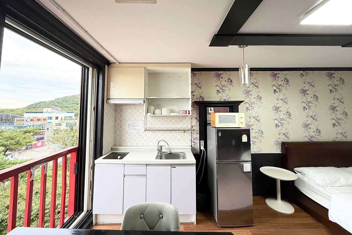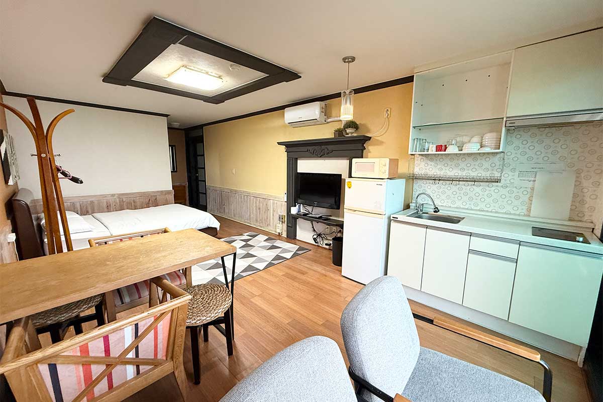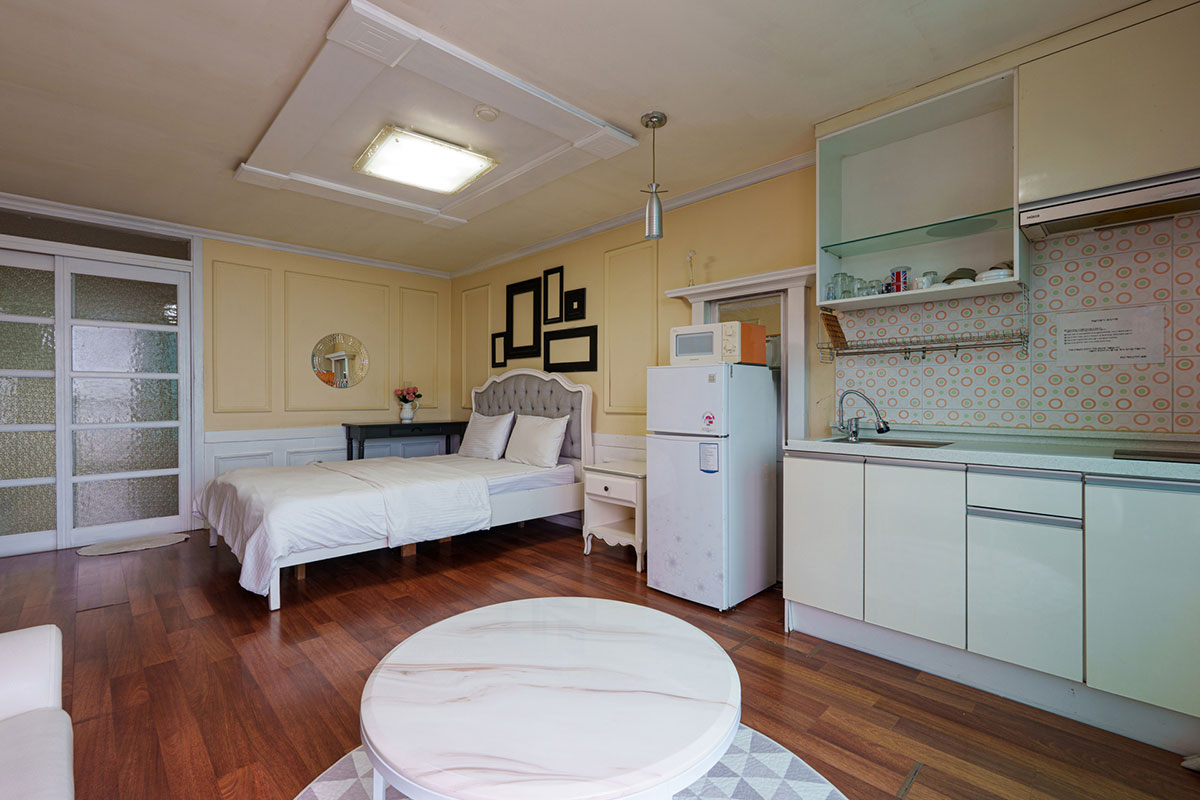 구비시설 TV(넷플릭스, 유튜브),침대,식탁,에어컨,냉장고,드라이기,취사도구,전기밥솥,전자레인지,핫플레이트,인터넷,객실샤워실,세면도구,난방,커피 메이커,욕실용품,소화기,화재 경보기