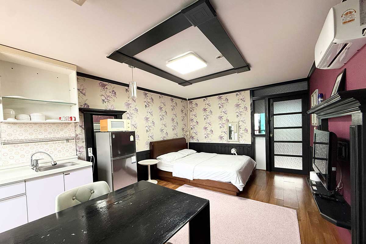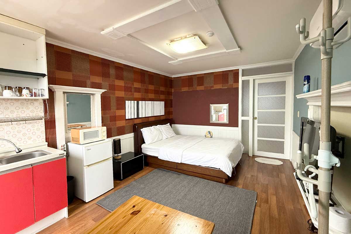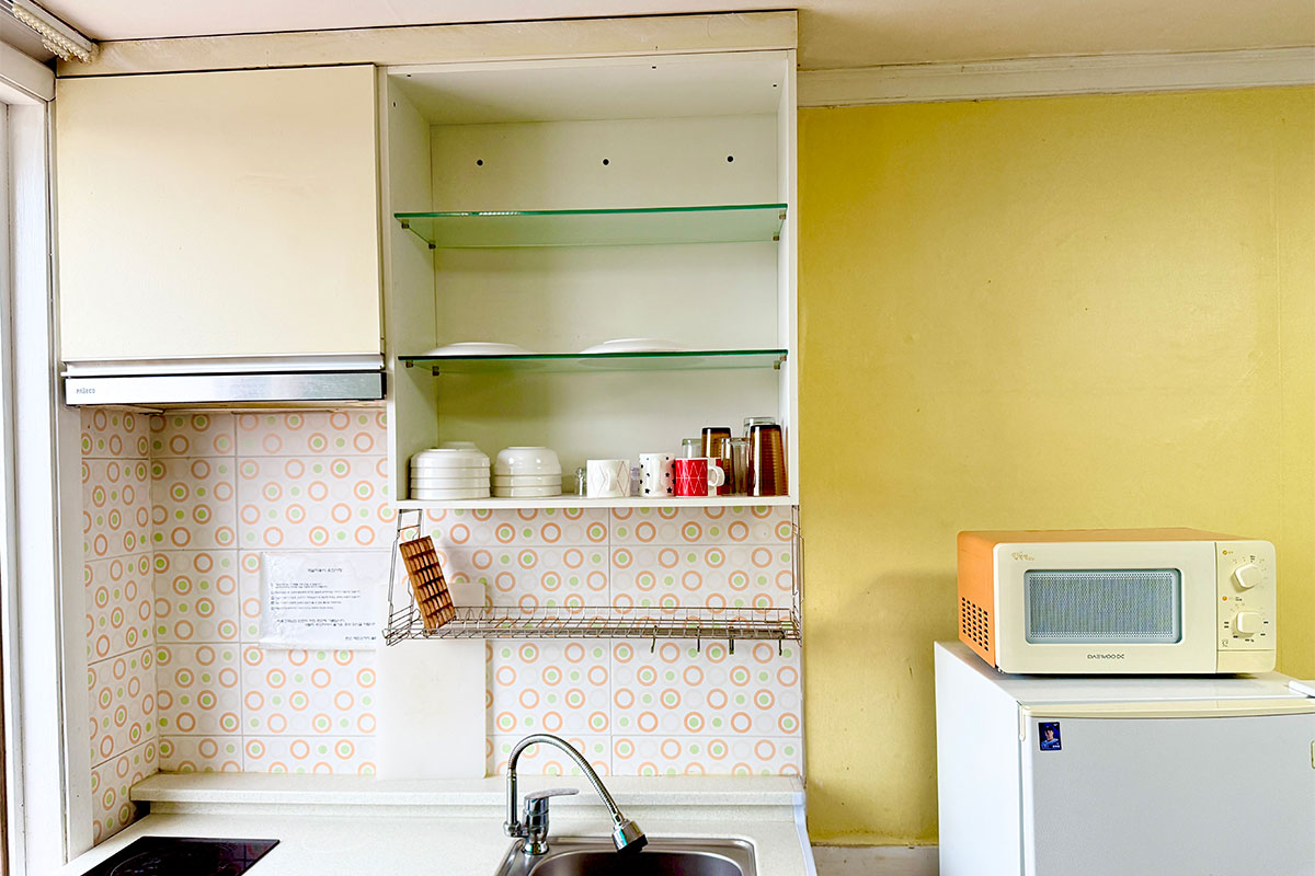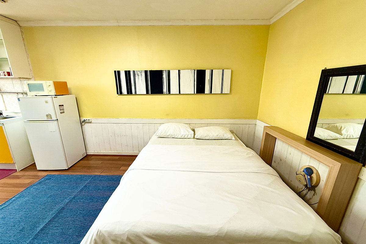 구비시설 TV(넷플릭스, 유튜브),침대,식탁,에어컨,냉장고,드라이기,취사도구,전기밥솥,전자레인지,핫플레이트,인터넷,객실샤워실,난방,욕실용품,커피 메이커,소화기,화재 경보기,세면도구