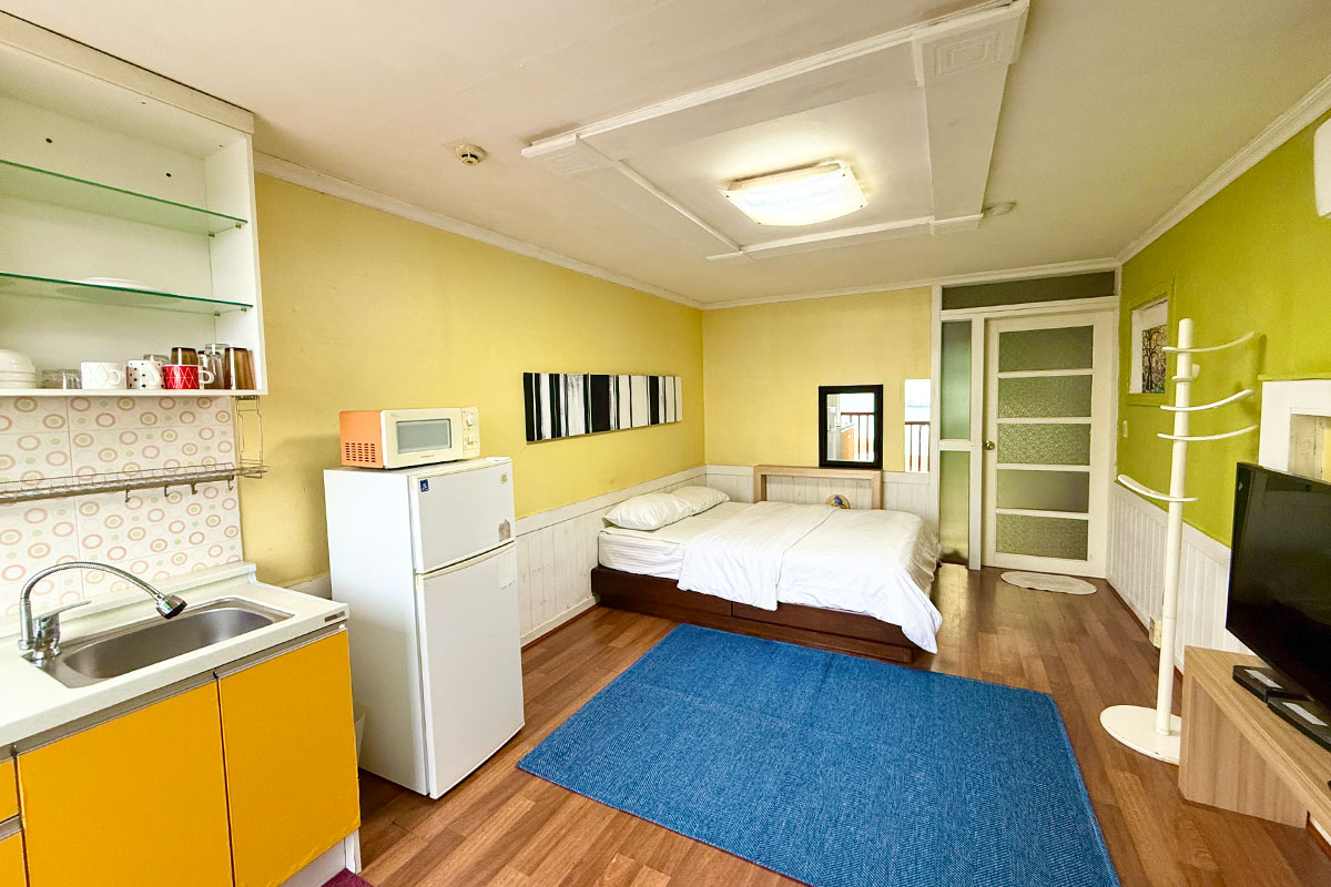 구비시설 TV(넷플릭스, 유튜브),침대,식탁,에어컨,냉장고,드라이기,취사도구,전기밥솥,전자레인지,핫플레이트,인터넷,객실샤워실,세면도구,난방,욕실용품,커피 메이커,소화기,화재 경보기
