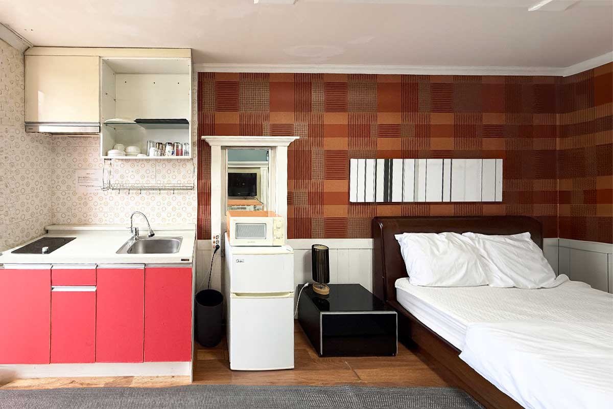 구비시설 TV(넷플릭스, 유튜브),침대,식탁,에어컨,냉장고,드라이기,취사도구,전기밥솥,전자레인지,핫플레이트,인터넷,객실샤워실,욕실용품,커피 메이커,소화기,화재 경보기,세면도구,난방